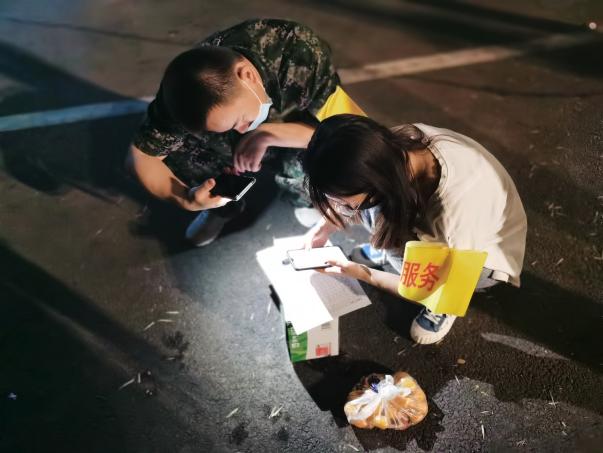 每位志愿者負(fù)責(zé)三棟樓,以確保片區(qū)居民都能安心居家隔離。走在凌晨的街道,路燈昏暗,四下無人,寂靜的只有蟲鳴和樹葉窸窣。