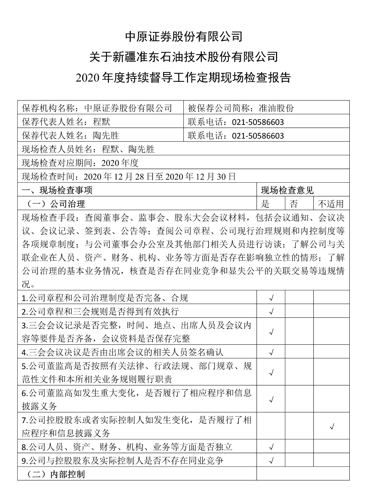 >> 中原證券關于準油股份2020年度持續(xù)督導工作定期現(xiàn)場檢查報告